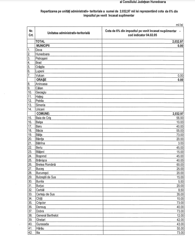 Consiliul Județean Hunedoara s-a întrunit luni în ședință extraordinară pentru a aproba proiectul privind ”repartizarea pe unități administrativ – teritoriale a impozitului pe venit încasat suplimentar, corespunzător cotei de 6% prevăzută în Legea bugetului de stat pe anul 2023”.
