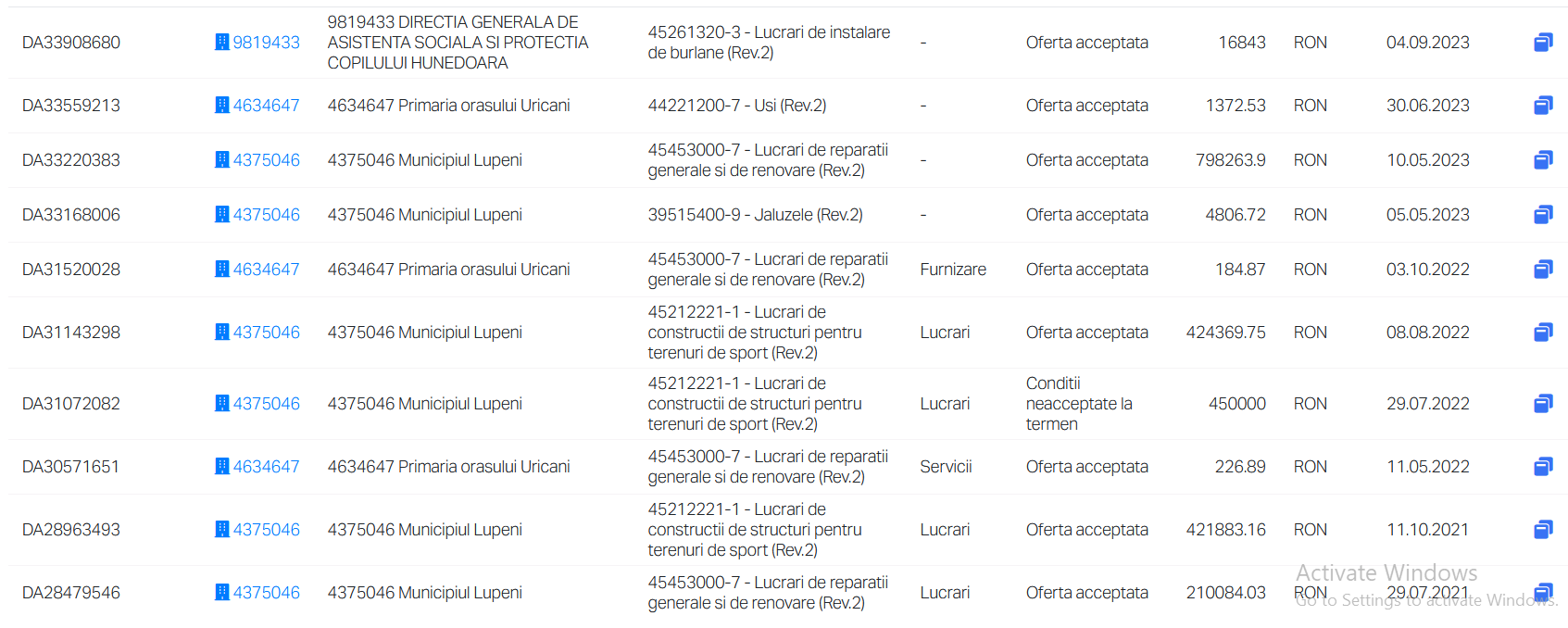 Printr-una dintre cele trei firme la care este acționar, Huda primește contract după contract pentru obiectivele de investiții de interes comunitar, fie că vorbim despre municipalitate, ori de instituții subordonate, cum ar fi spitalul din Lupeni.