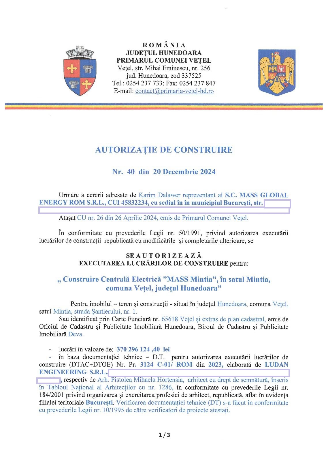 Primăria Comunei Vețel a emis autorizația de construire pentru centrala electrică de la Mintia, cea mai mare investiție din România în domeniul energetic din ultimii ani și, totodată, cea mai mare și modernă din Europa.
