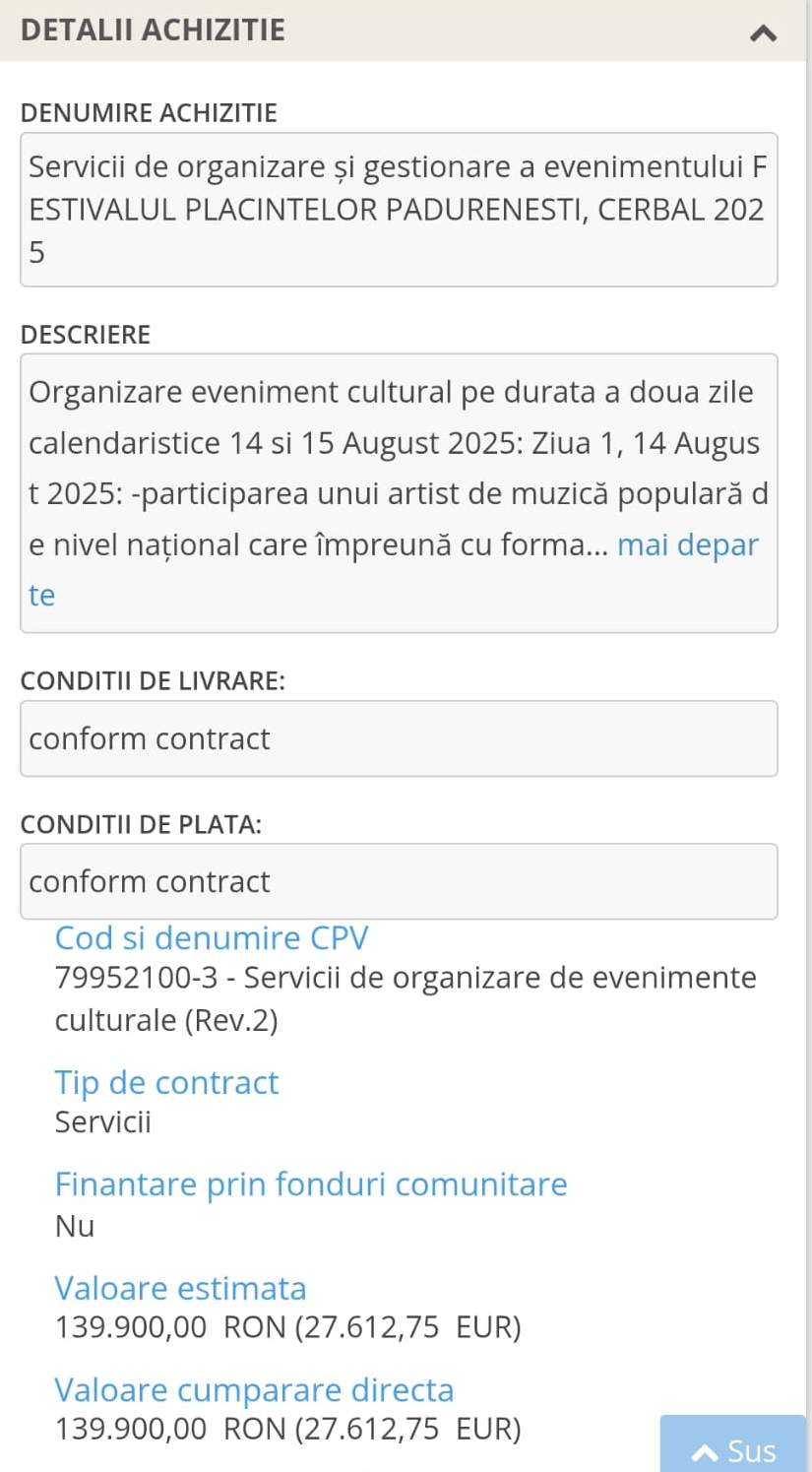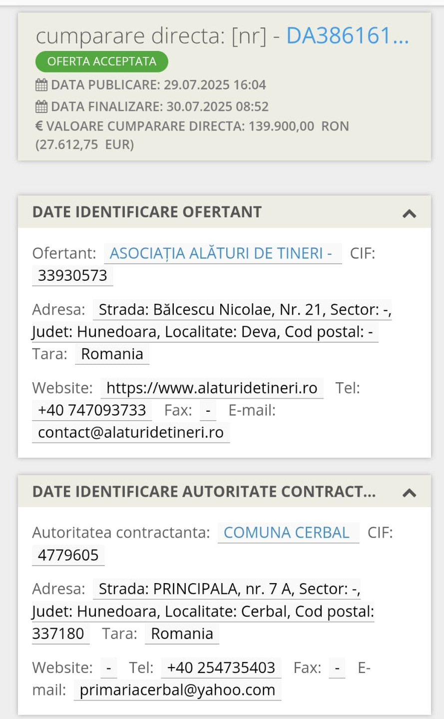 Potrivit informațiilor publice, Primăria Cerbăl, condusă de PSD, a atribuit asociației, prin încredințare directă, un contract în valoare de 139.900 de lei pentru serviciile de organizare și gestionare a festivalului. Emanuel Clej spune că suma acoperă nu doar tarifele de organizare propriu -zisă, dar și onorariile pentru artiști, formații și ansambluri populare, plata instrumentiștilor și a prezentatorului, promovarea evenimentului, cazarea, masa și transportul acestora.
