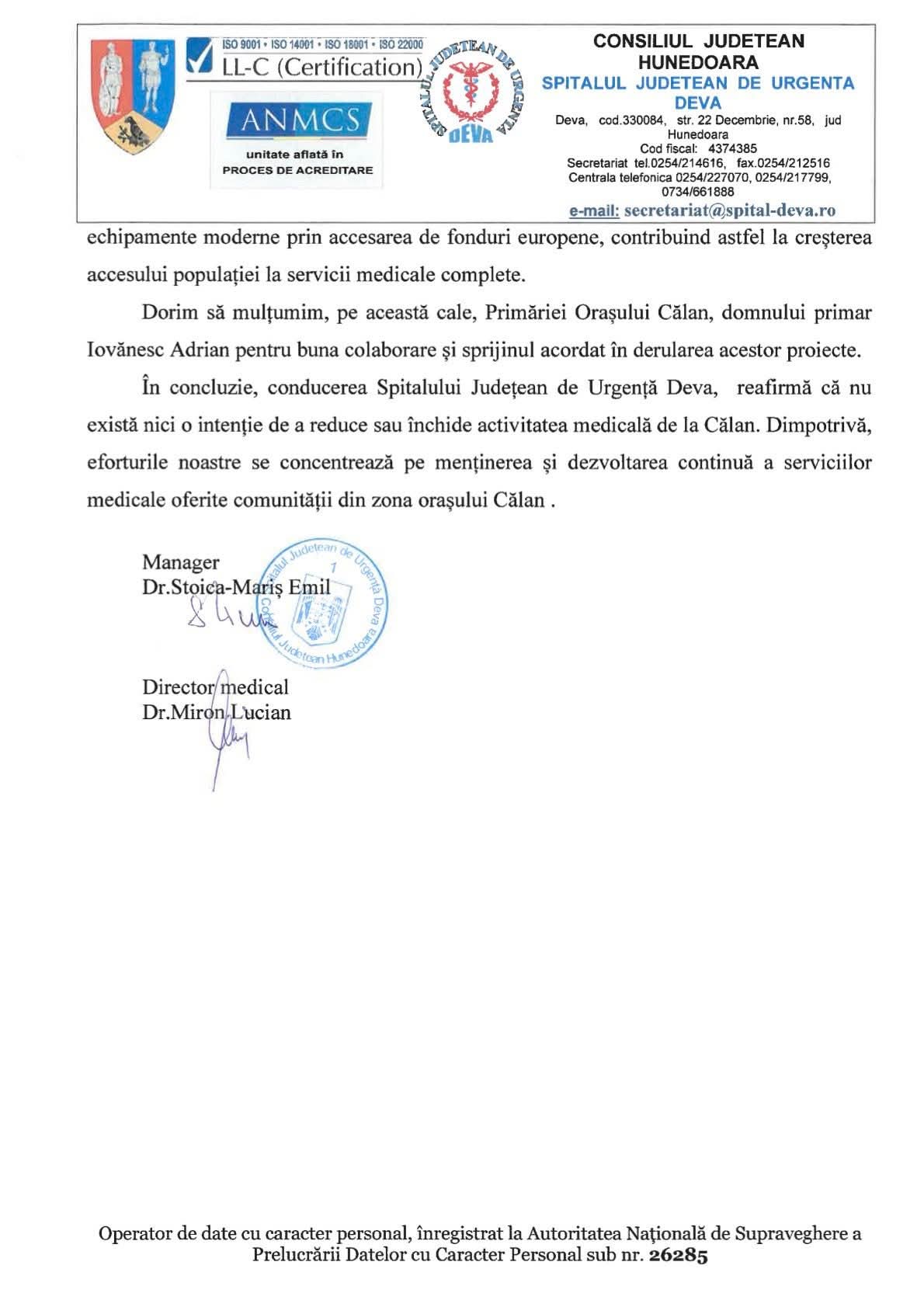 Potrivit răspunsului primit de aceasta de la Spitalul Județean de Urgență Deva, instituția nu are în vedere nicio măsură de închidere a UPU Călan, iar continuitatea serviciilor medicale în zonă este asigurată.